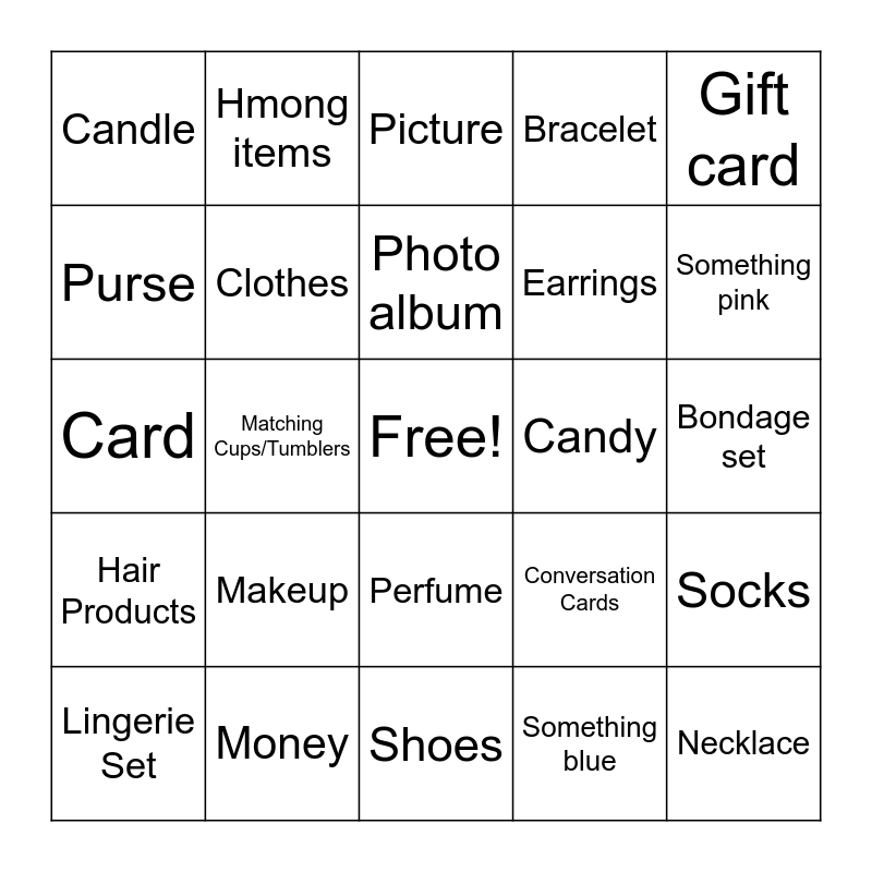 This bingo card has a free space and 29 words: Lingerie Set, Panty, Matching Cups/Tumblers, Apron, Candle, Picture, Clothes, Makeup, Candy, Money, Bondage set, Necklace, Shoes, Something blue, Something pink, Cookware, Perfume, Hair Products, Gift card, Card, Conversation Cards, Date night scratch offs, Earrings, Purse, Bracelet, Hmong items, Socks, Photo album and Shirt.