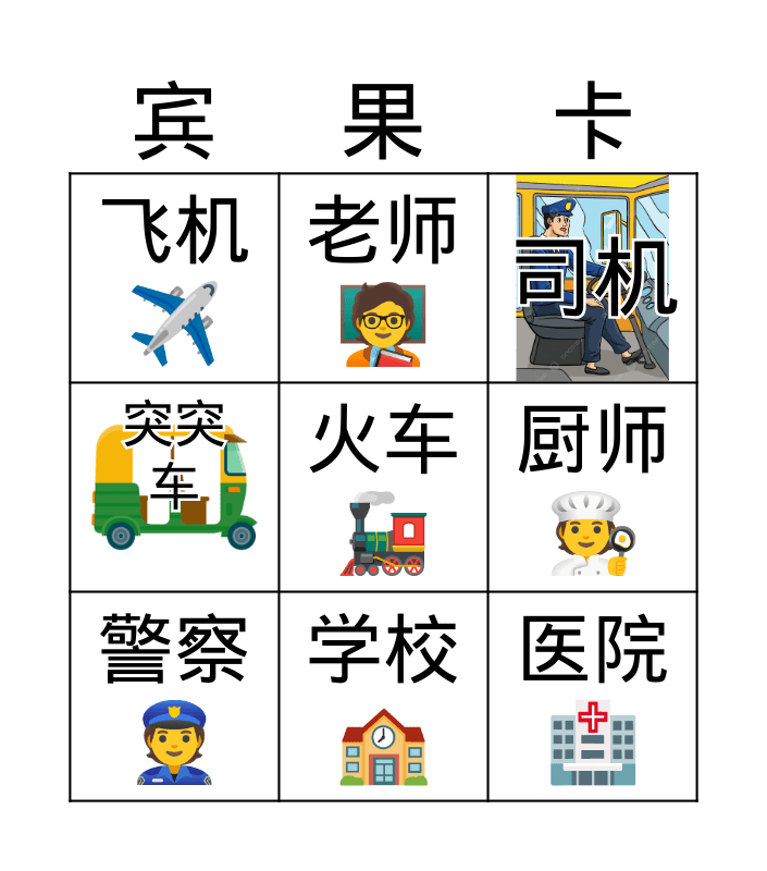 This bingo card has 2 images, a free space and 11 words: 医生 🧑⚕️, 学校 🏫, 医院 🏥, 警察 👮, 老师 🧑🏫, 司机, 厨师 🧑🍳, 消防员🧑🚒, 突突车, 飞机 ✈️ and 汽车 🚗.