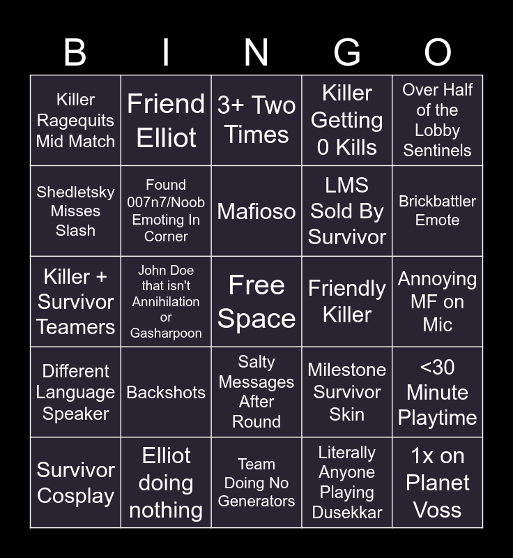 This bingo card has a free space and 24 words: Backshots, Elliot doing nothing, Mafioso, Survivor Cosplay, Over Half of the Lobby Sentinels, Killer Ragequits Mid Match, Shedletsky Misses Slash, Friend Elliot, Friendly Killer, Salty Messages After Round, LMS Sold By Survivor, Killer + Survivor Teamers, Milestone Survivor Skin, <30 Minute Playtime, Found 007n7/Noob Emoting In Corner, Literally Anyone Playing Dusekkar, Annoying MF on Mic, 3+ Two Times, Brickbattler Emote, John Doe that isn't Annihilation or Gasharpoon, 1x on Planet Voss, Different Language Speaker, Killer Getting 0 Kills and Team Doing No Generators.