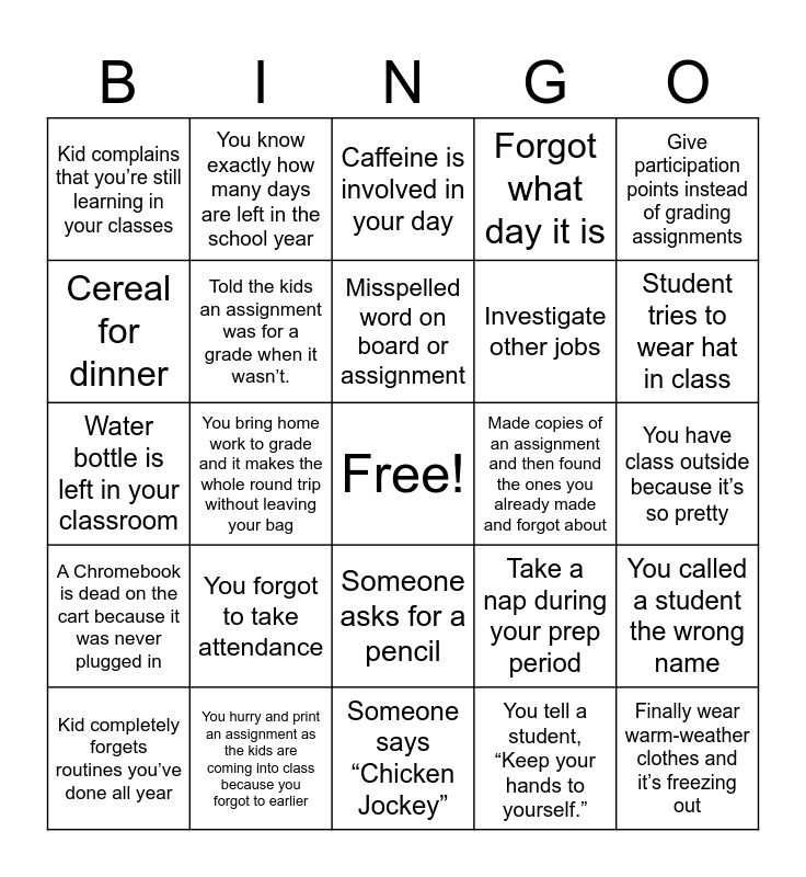 This bingo card has a free space and 29 words: Kid completely forgets routines you’ve done all year, You’re too tired to do the lesson you prepared, so you watch a movie instead, You bring home work to grade and it makes the whole round trip without leaving your bag, You hit snooze more than twice., Kid complains that you’re still learning in your classes, Caffeine is involved in your day, Told the kids an assignment was for a grade when it wasn’t., You forgot to take attendance, Made copies of an assignment and then found the ones you already made and forgot about, You hurry and print an assignment as the kids are coming into class because you forgot to earlier, You have class outside because it’s so pretty, Finally wear warm-weather clothes and it’s freezing out, Someone says “Chicken Jockey”, You tell a student, “Keep your hands to yourself.”, Student tries to wear hat in class, Hoodie is left in your classroom, Someone asks for a pencil, A Chromebook is dead on the cart because it was never plugged in, Give participation points instead of grading assignments, Water bottle is left in your classroom, Take a nap during your prep period, Crop dust the students, Investigate other jobs, Cereal for dinner, Forgot what day it is, You know exactly how many days are left in the school year, You called a student the wrong name, Misspelled word on board or assignment and Student ends up on the floor at some point during class.