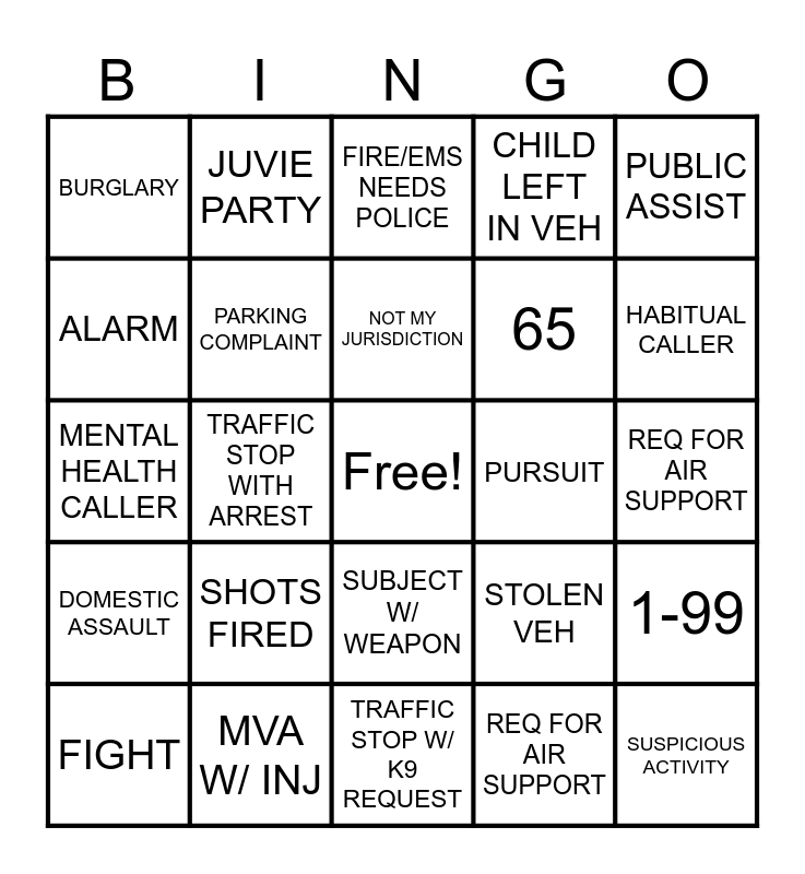 This bingo card has a free space and 24 words: SHOTS FIRED, MVA W/ INJ, NOT MY JURISDICTION, FIGHT, PUBLIC ASSIST, BURGLARY, ALARM, JUVIE PARTY, PURSUIT, SUBJECT W/ WEAPON, 65, MENTAL HEALTH CALLER, STOLEN VEH, 1-99, PARKING COMPLAINT, REQ FOR AIR SUPPORT, REQ FOR AIR SUPPORT, FIRE/EMS NEEDS POLICE, HABITUAL CALLER, TRAFFIC STOP WITH ARREST, SUSPICIOUS ACTIVITY, DOMESTIC ASSAULT, CHILD LEFT IN VEH and TRAFFIC STOP W/ K9 REQUEST.
