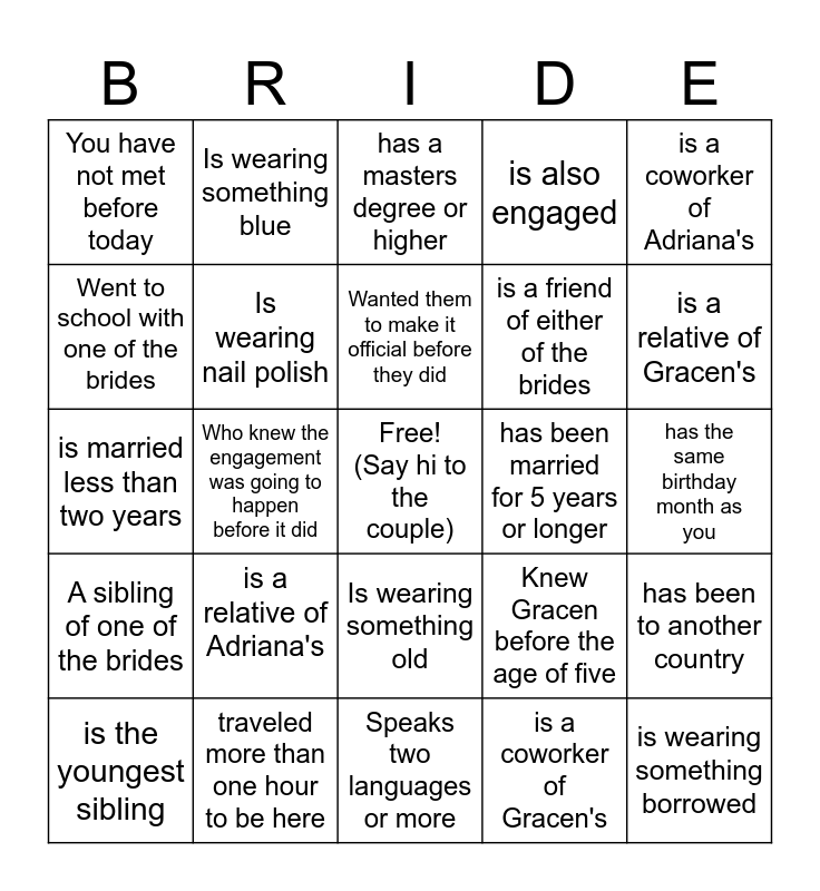 This bingo card has a free space and 24 words: is a relative of Adriana's, traveled more than one hour to be here, Wanted them to make it official before they did, is the youngest sibling, is a coworker of Adriana's, You have not met before today, Went to school with one of the brides, Is wearing something blue, has been married for 5 years or longer, Is wearing something old, is a friend of either of the brides, is married less than two years, Knew Gracen before the age of five, has been to another country, Is wearing nail polish, is a coworker of Gracen's, has the same birthday month as you, has a masters degree or higher, is a relative of Gracen's, Who knew the engagement was going to happen before it did, is wearing something borrowed, A sibling of one of the brides, is also engaged and Speaks two languages or more.