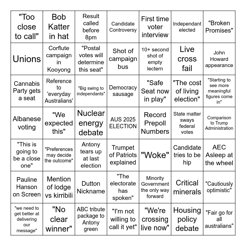 This bingo card has a free space and 48 words: Minority Government the only way forward, Live cross fail, "I'm not willing to call it yet", "We expected this", "Big swing to independants", Comparison to Trump Administration, Bob Katter in hat, "No clear winner", Independant elected, Trumpet of Patriots explained, "Broken Promises", Candidate Controversy, "The cost of living election", "Safe Seat now in play", Pauline Hanson on Screen, State matter sways federal votes, Unions, John Howard appearance, Critical minerals, First time voter interview, 10+ second shot of empty lectern, Nuclear energy debate, "Too close to call", Corflute campaign in Kooyong, "Cautiously optimistic", "Postal votes will determine this seat", "Starting to see more meaningful figures come in", "we need to get better at delivering our message", Democracy sausage, Reference to 'everyday Australians', Housing policy debate, Record Prepoll Numbers, AEC Asleep at the wheel, Mention of lodge vs kirribili, Albanese voting, "Woke", Candidate tries to be hip, Cannabis Party gets a seat, Antony tears up at last election, Dutton Nickname, "This is going to be a close one", "Fair go for all australians", Result called before 8pm, ABC tribute package to Antony green, Shot of campaign bus, "The electorate has spoken", "Preferences may decide the outcome" and "We're crossing live now".