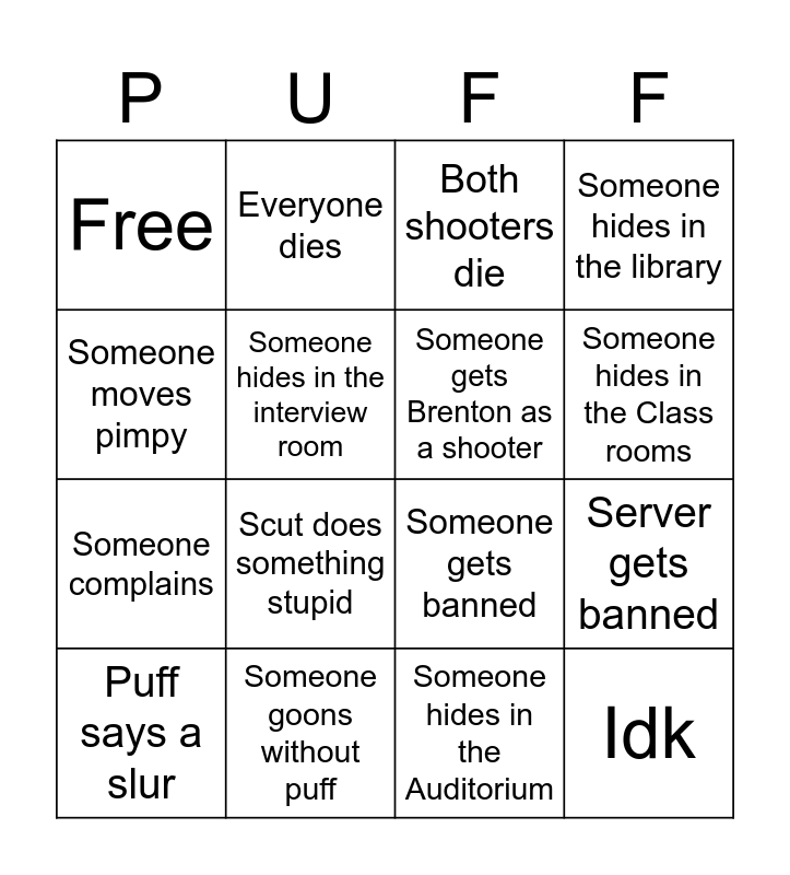 This bingo card has 16 words: Puff says a slur, Someone goons without puff, Both shooters die, Someone hides in the library, Someone moves pimpy, Everyone dies, Someone gets banned, Server gets banned, Free, Someone hides in the interview room, Someone hides in the Auditorium, Someone hides in the Class rooms, Someone complains, Scut does something stupid, Someone gets Brenton as a shooter and Idk.