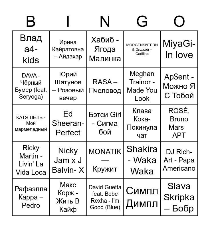 This bingo card has 41 words: Free!, КАТЯ ЛЕЛЬ - Мой мармеладный, GAYAZOV$ BROTHER$ — МАЛИНОВАЯ ЛАДА, Юрий Шатунов – Розовый вечер, Макс Корж - Жить В Кайф, MONATIK — Кружит, RASA – Пчеловод, Jazzdauren - Я подарю Вам ландыши, MiyaGi- In love, Ricky Martin - Livin' La Vida Loca, Ed Sheeran- Perfect, MORGENSHTERN & Элджей – Cadillac, Бэтси Girl - Сигма бой, ROSÉ, Bruno Mars – APT, Клава Кока-Покинула чат, Nicky Jam x J Balvin- X, Слава Марлоу-Ты Горишь Как Огонь, Влад a4- kids, Капибара, Хабиб - Ягода Малинка, DJ Rich-Art - Papa Americano, Slava Skripka – Бобр, David Guetta feat. Bebe Rexha - I'm Good (Blue), Meghan Trainor - Made You Look, Кобяков – Пушка, Звери - Районы, кварталы, Симпл Димпл, Мама я в Дубае, Ap$ent - Можно Я С Тобой, 5УТРА - Давай сбежим, Кравц feat. Гио ПиКа - Где Прошла Ты, Ирина Кайратовна – Айдахар, Рафаэлла Карра – Pedro, Perfam - Я Банан!, Shakira - Waka Waka, DAVA - Чёрный Бумер (feat. Seryoga), Джиган, Artik, Asti, NILETTO – Худи, Jakone feat. Kiliana – Асфальт, Zivert – Эгоистка, PSY - GANGNAM STYLE and Becky G - Bella Ciao.