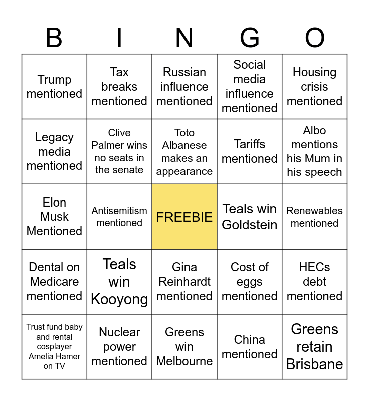 This bingo card has a free space and 29 words: Trust fund baby and rental cosplayer Amelia Hamer on TV, Dutton loses the seat of Dickson, Antisemitism mentioned, Cost of living mentioned, Trump mentioned, Russian influence mentioned, Clive Palmer wins no seats in the senate, Teals win Kooyong, Teals win Goldstein, Nuclear power mentioned, Renewables mentioned, Greens retain Brisbane, Greens win Melbourne, China mentioned, Albo mentions his Mum in his speech, Climate change DENIED, Gina Reinhardt mentioned, Dental on Medicare mentioned, Housing crisis mentioned, Elon Musk Mentioned, Cost of eggs mentioned, Baby is kissed, Tariffs mentioned, Legacy media mentioned, Social media influence mentioned, Tax breaks mentioned, HECs debt mentioned, Toto Albanese makes an appearance and Adam Bandt holding a giant toothbrush.