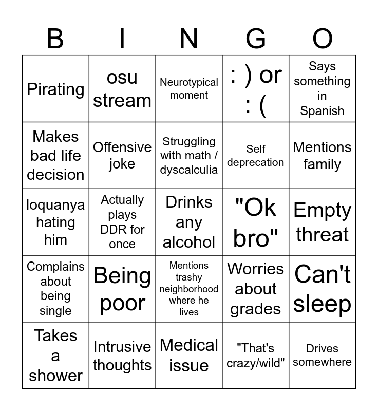This bingo card has a free space and 24 words: Being poor, Intrusive thoughts, Struggling with math / dyscalculia, Takes a shower, Says something in Spanish, Pirating, Makes bad life decision, osu stream, "Ok bro", Mentions trashy neighborhood where he lives, Self deprecation, loquanya hating him, Worries about grades, Can't sleep, Offensive joke, "That's crazy/wild", Empty threat, Neurotypical moment, Mentions family, Actually plays DDR for once, Drives somewhere, Complains about being single, : ) or : ( and Medical issue.