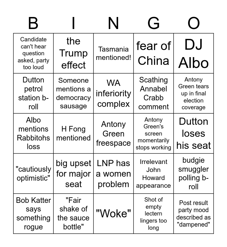 This bingo card has a free space and 29 words: Bob Katter says something rogue, Dutton or Albo use the words "very clear" 3 consecutive times in a soundbite, H Fong mentioned, Barnaby Joyce, red-faced, Candidate can't hear question asked, party too loud, Tasmania mentioned!, Someone mentions a democracy sausage, big upset for major seat, Antony Green's screen momentarily stops working, "Fair shake of the sauce bottle", Dutton loses his seat, Post result party mood described as "dampened", "Woke", Shot of empty lectern lingers too long, Antony Green tears up in final election coverage, "I'm not willing to call it yet", LNP has a women problem, "cautiously optimistic", DJ Albo, Albo mentions Rabbitohs loss, Irrelevant John Howard appearance, "A vote for the teals is a vote for the greens", Scathing Annabel Crabb comment, Dutton petrol station b-roll, fear of China, the Trump effect, budgie smuggler polling b-roll, WA inferiority complex and "cozzie livs".