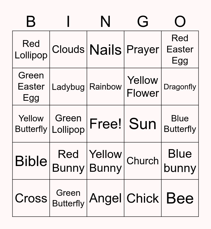 This bingo card has a free space and 39 words: Basket of Eggs, Empty Tomb, Red Butterfly, Ladybug, Cross, Yellow Bunny, Rainbow, Blue Flower, Red Easter Egg, Bible, Green Lollipop, Prayer, Bee, Blue Butterfly, Sun, Red Bunny, Dove, Red Lollipop, Bread & Wine, Church, Green Easter Egg, Angel, Yellow Flower, Dragonfly, Lamb, Blue Lollipop, Carrot, Green Bunny, Red Flower, Clouds, Blue Easter Egg, Candle, Nails, Green Butterfly, Chick, Yellow Lollipop, Blue bunny, Yellow Butterfly and Green Flower.
