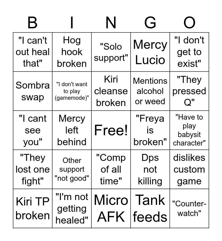 This bingo card has a free space and 24 words: Other support "not good", "I'm not getting healed", Kiri cleanse broken, Kiri TP broken, "I don't get to exist", "I can't out heal that", Sombra swap, Hog hook broken, "Freya is broken", "Comp of all time", Mentions alcohol or weed, "I cant see you", Dps not killing, dislikes custom game, "I don't want to play (gamemode)", Tank feeds, "Have to play babysit character", "Solo support", "They pressed Q", Mercy left behind, "Counter- watch", "They lost one fight", Mercy Lucio and Micro AFK.