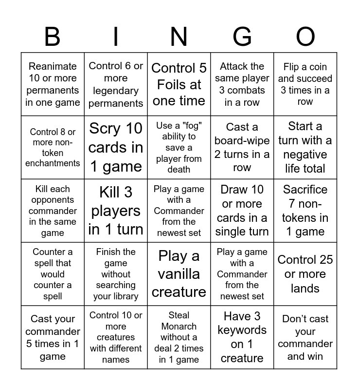 This bingo card has a free space and 24 words: Finish the game without searching your library, Control 10 or more creatures with different names, Use a "fog" ability to save a player from death, Cast your commander 5 times in 1 game, Flip a coin and succeed 3 times in a row, Reanimate 10 or more permanents in one game, Control 8 or more non-token enchantments, Control 6 or more legendary permanents, Draw 10 or more cards in a single turn, Play a vanilla creature, Cast a board-wipe 2 turns in a row, Kill each opponents commander in the same game, Play a game with a Commander from the newest set, Control 25 or more lands, Scry 10 cards in 1 game, Have 3 keywords on 1 creature, Sacrifice 7 non-tokens in 1 game, Control 5 Foils at one time, Start a turn with a negative life total, Kill 3 players in 1 turn, Don’t cast your commander and win, Counter a spell that would counter a spell, Attack the same player 3 combats in a row and Steal Monarch without a deal 2 times in 1 game.