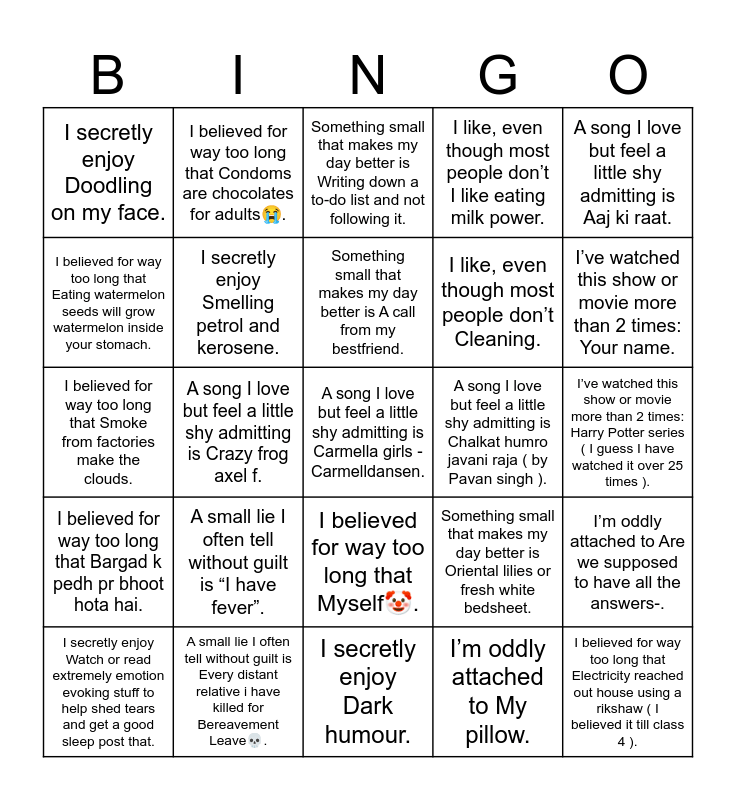 This bingo card has 56 words: I secretly enjoy Sour candy., I secretly enjoy Watch or read extremely emotion evoking stuff to help shed tears and get a good sleep post that., I secretly enjoy Sound of typing on keyboard., I secretly enjoy Doodling on my face., I secretly enjoy Dark humour., I secretly enjoy Racism., I secretly enjoy Smelling petrol and kerosene., I like, even though most people don’t Rice and potato chips., I like, even though most people don’t Cleaning., I like, even though most people don’t Sweat., I like, even though most people don’t I like eating milk power., I like, even though most people don’t Myself🫠., I like, even though most people don’t My jokes:)., I like, even though most people don’t Summer season., A song I love but feel a little shy admitting is 7 element - vitas., A song I love but feel a little shy admitting is Doja cat songs., A song I love but feel a little shy admitting is Aaj ki raat., A song I love but feel a little shy admitting is Crazy frog axel f., A song I love but feel a little shy admitting is Sinchan's title song., A song I love but feel a little shy admitting is Carmella girls - Carmelldansen., A song I love but feel a little shy admitting is Chalkat humro javani raja ( by Pavan singh )., Something small that makes my day better is Mitti ki khusboo., Something small that makes my day better is Oriental lilies or fresh white bedsheet., Something small that makes my day better is Writing down a to-do list and not following it., Something small that makes my day better is Shaam ki chai., Something small that makes my day better is A call from my bestfriend., Something small that makes my day better is Nothing large makes it better let alone something small 🥹., Something small that makes my day better is No bugs in code., I’ve watched this show or movie more than 2 times: Your name., I’ve watched this show or movie more than 2 times: Fleabag., I’ve watched this show or movie more than 2 times: Stree., I’ve watched this show or movie more than 2 times: Yjhd., I’ve watched this show or movie more than 2 times: Interstellar., I’ve watched this show or movie more than 2 times: ZNMD., I’ve watched this show or movie more than 2 times: Harry Potter series ( I guess I have watched it over 25 times )., I believed for way too long that Eating watermelon seeds will grow watermelon inside your stomach., I believed for way too long that Smoke from factories make the clouds., I believed for way too long that Chappal ulti nhi rakho., I believed for way too long that Bargad k pedh pr bhoot hota hai., I believed for way too long that Condoms are chocolates for adults😭., I believed for way too long that Myself🤡., I believed for way too long that Electricity reached out house using a rikshaw ( I believed it till class 4 )., A small lie I often tell without guilt is Mein bathroom pe tha., A small lie I often tell without guilt is I am super fit., A small lie I often tell without guilt is Gossip., A small lie I often tell without guilt is “I have fever”., A small lie I often tell without guilt is Every distant relative i have killed for Bereavement Leave💀., A small lie I often tell without guilt is I’ll be on time., A small lie I often tell without guilt is I did not see ur missed call ( probably because I want to ignore that person)., I’m oddly attached to Rocks., I’m oddly attached to My pillow., I’m oddly attached to Fantasy of having read a book., I’m oddly attached to Small wood boxes., I’m oddly attached to My bike., I’m oddly attached to Are we supposed to have all the answers-. and I’m oddly attached to My pet fish..