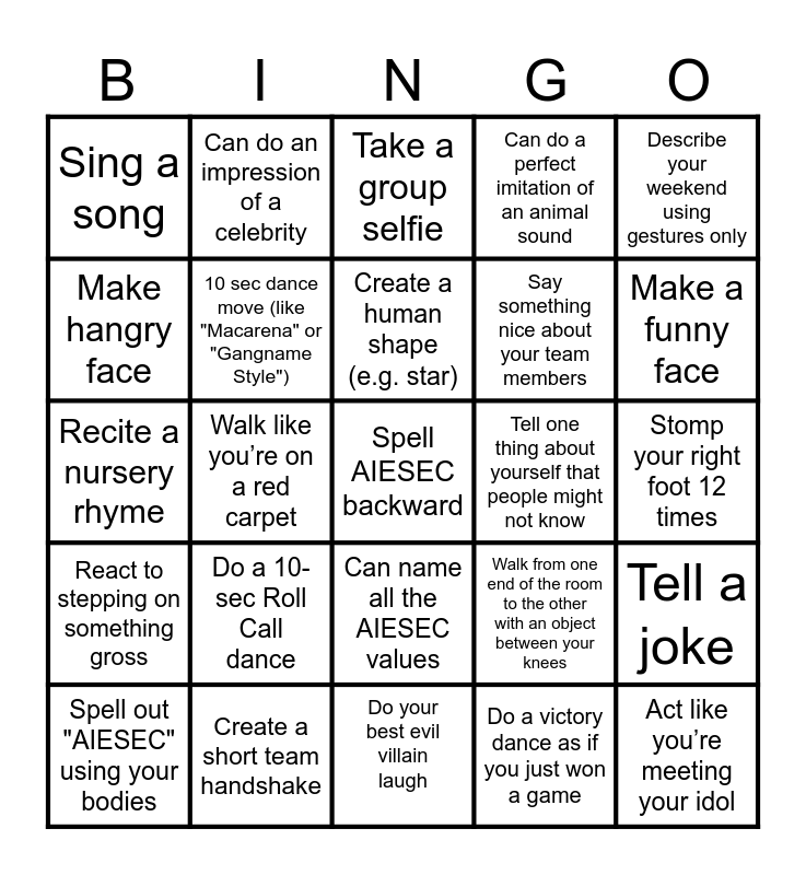 This bingo card has a free space and 24 words: Do a 10-sec Roll Call dance, Create a short team handshake, Create a human shape (e.g. star), Spell out "AIESEC" using your bodies, Describe your weekend using gestures only, Sing a song, Make hangry face, Can do an impression of a celebrity, Tell one thing about yourself that people might not know, Can name all the AIESEC values, Say something nice about your team members, Recite a nursery rhyme, Walk from one end of the room to the other with an object between your knees, Tell a joke, 10 sec dance move (like "Macarena" or "Gangname Style"), Do a victory dance as if you just won a game, Stomp your right foot 12 times, Take a group selfie, Make a funny face, Walk like you’re on a red carpet, Act like you’re meeting your idol, React to stepping on something gross, Can do a perfect imitation of an animal sound and Do your best evil villain laugh.