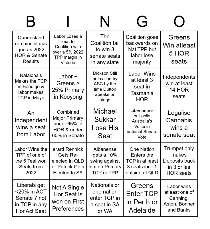 This bingo card has a free space and 24 words: erard Rennick Gets Re-elected in QLD or Patrick Gets Elected In SA, Not A Single Hor Seat is won on First Preferences, Dickson Still not called by ABC by the time Dutton Speaks on stage, Liberals get <20% in ACT Senate 7 not in TCP in any Hor Act Seat, Greens Win atleast 5 HOR seats, Quuensland remains status quo as 2022 HOR & Senate Results, Nataionals Makes the TCP in Bendigo & labor makes TCP in Mayo, Labor Loses a seat to Coalition with over a 5% 2022 TPP margin in Victoria, Libertarians out-polls Australia's Voice in national Senate Vote, Albanense gets a 10% swing against him on Primary TCP or TPP, Labor Wins at least 3 seat in Tasmania HOR, An Independent wins a seat from Labor, One Nation Enters the TCP in at least 3 seats incl. 1 outside of QLD, Trumpet only makes Deposits back in 3 or les HOR seats, Labor + Greens > 25% Primary in Kooyong, Greens Enter TCP in Perth or Adelaide, Legalise Cannabis wins a senate seat, The Coalition fail to win 3 senate seats in any state, Independents win at least 14 HOR seats, Combined Major Primary under 65% in HOR & under 60% in Senate, Labor wins atleast one of Canning, Aston, Bonner and Banks, Labor Wins the TPP of one of the 6 Teal won Seats from 2022, Coalition goes backwards on Nat TPP but labor lose majority and Nationals or one nation enter TCP in a seat in SA or WA.