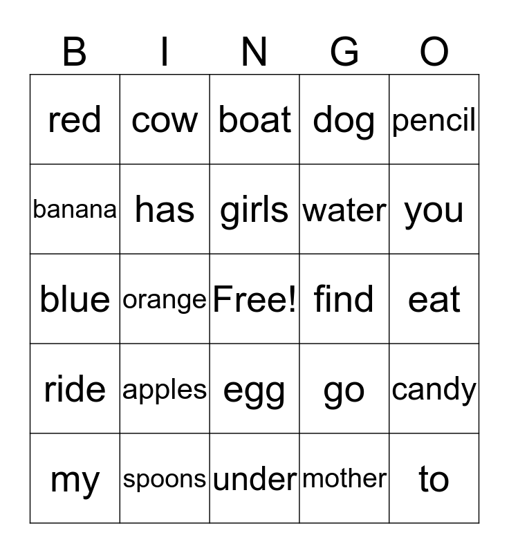 This bingo card has a free space and 24 words: apples, spoons, girls, my, pencil, red, banana, cow, find, egg, water, blue, go, candy, has, mother, eat, boat, you, orange, to, ride, dog and under.