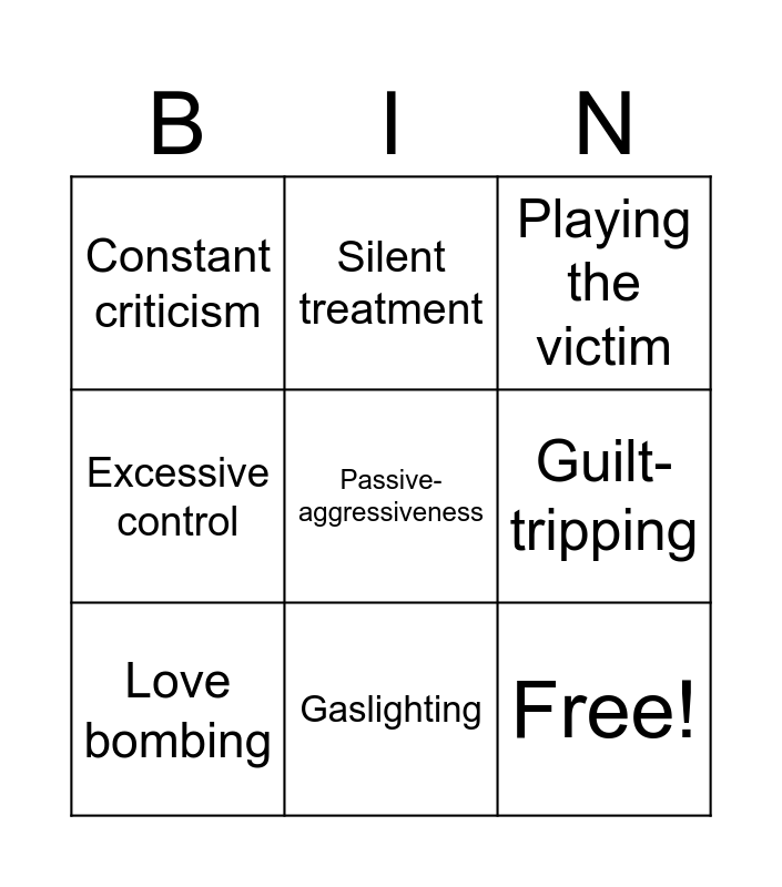 This bingo card has 11 words: Free!, Gaslighting, Passive-aggressiveness, Love bombing, Silent treatment, Playing the victim, Guilt-tripping, Blame-shifting, Excessive control, Constant criticism and Jealousy disguised as care.