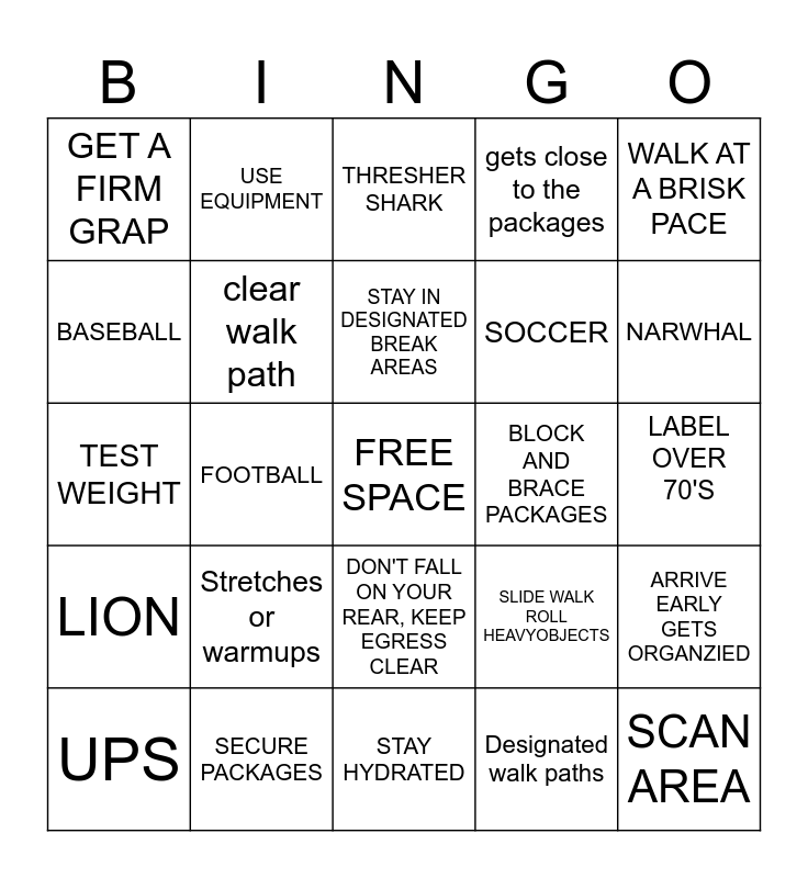 This bingo card has a free space and 44 words: Dress to control body heat, Stretches or warmups, Pinch points, Designated walk paths, faces ladders, 3 point of contact, clear walk path, stay off unsecure belts, gets close to the packages, SCAN AREA, GET A FIRM GRAP, SECURE PACKAGES, SLIDE WALK ROLL HEAVYOBJECTS, LABEL OVER 70'S, EMERGENCY EVACUATION PLAN, DON'T TOUCH , LEAVE AREA, NOTIFY SUP, STAY HYDRATED, BLOCK AND BRACE PACKAGES, Bend AT THE KNEES. DROP IT LIKE ITS HOT, TEST WEIGHT, USE EQUIPMENT, DON'T FALL ON YOUR REAR, KEEP EGRESS CLEAR, LOOK BEFORE STEPPING, WALK AT A BRISK PACE, LIFTING AND LOWERING, FIRM FOOTING, STAY IN DESIGNATED BREAK AREAS, YARD CONTROL, ARRIVE EARLY GETS ORGANZIED, UPS, HAIR LESS CAT, THRESHER SHARK, PICKEL, HOCKEY, LION, EAGLE, FOX, KILLER WHALE, NARWHAL, BASEBALL, FOOTBALL, VOLLEYBALL, SOCCER and GOLF.