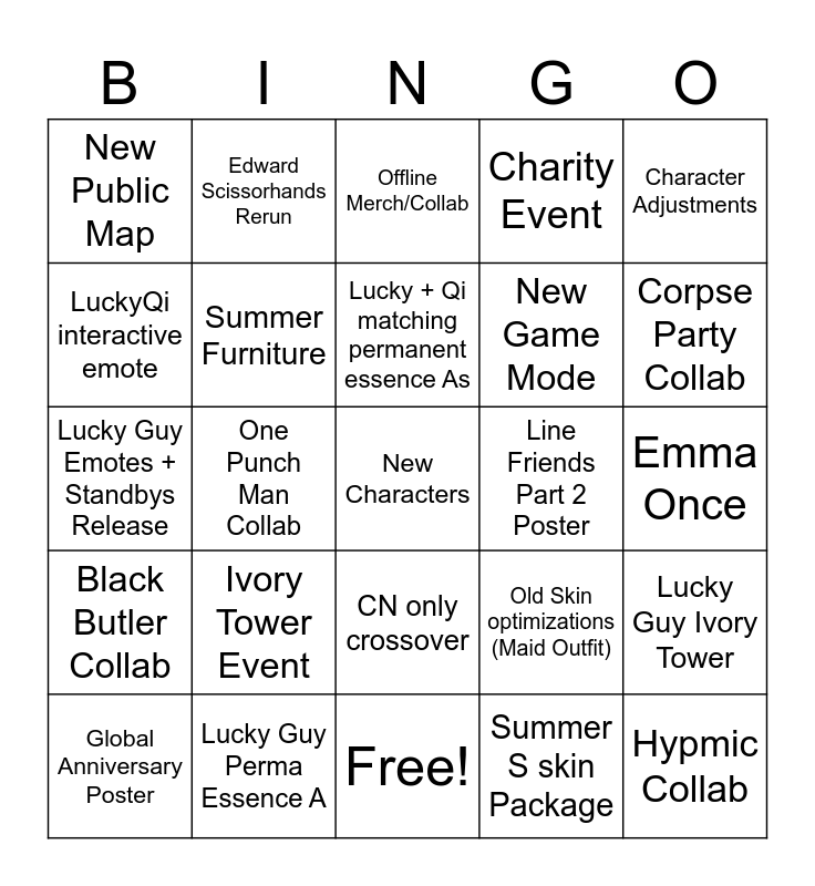 This bingo card has 25 words: Black Butler Collab, Lucky Guy Perma Essence A, New Characters, Summer S skin Package, Character Adjustments, New Public Map, Edward Scissorhands Rerun, Offline Merch/Collab, Line Friends Part 2 Poster, Lucky Guy Ivory Tower, LuckyQi interactive emote, Summer Furniture, Free!, Old Skin optimizations (Maid Outfit), Corpse Party Collab, Global Anniversary Poster, One Punch Man Collab, Lucky + Qi matching permanent essence As, New Game Mode, Emma Once, Lucky Guy Emotes + Standbys Release, Ivory Tower Event, CN only crossover, Charity Event and Hypmic Collab.