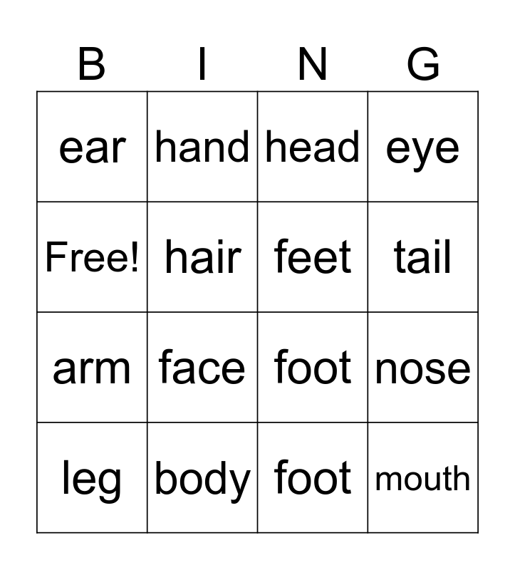 This bingo card has 16 words: body, nose, head, ear, arm, hand, foot, foot, Free!, hair, leg, eye, face, tail, feet and mouth.