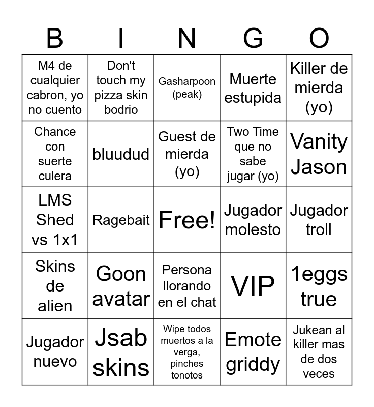 This bingo card has a free space and 24 words: Goon avatar, Jsab skins, Guest de mierda (yo), Jugador nuevo, Killer de mierda (yo), M4 de cualquier cabron, yo no cuento, Chance con suerte culera, Don't touch my pizza skin bodrio, Jugador molesto, Persona llorando en el chat, Two Time que no sabe jugar (yo), LMS Shed vs 1x1, VIP, 1eggs true, bluudud, Emote griddy, Jugador troll, Gasharpoon (peak), Vanity Jason, Ragebait, Jukean al killer mas de dos veces, Skins de alien, Muerte estupida and Wipe todos muertos a la verga, pinches tonotos.