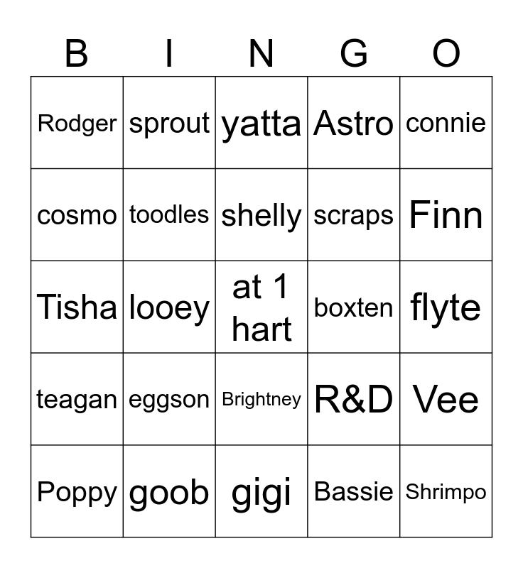 This bingo card has a free space and 29 words: Poppy, flutter, looey, Glisten, Rodger, yatta, toodles, eggson, boxten, goob, flyte, Shrimpo, gigi, Bassie, Finn, dandy, Brightney, teagan, connie, Tisha, R&D, cocoa, scraps, cosmo, Astro, sprout, Vee, shelly and peble.