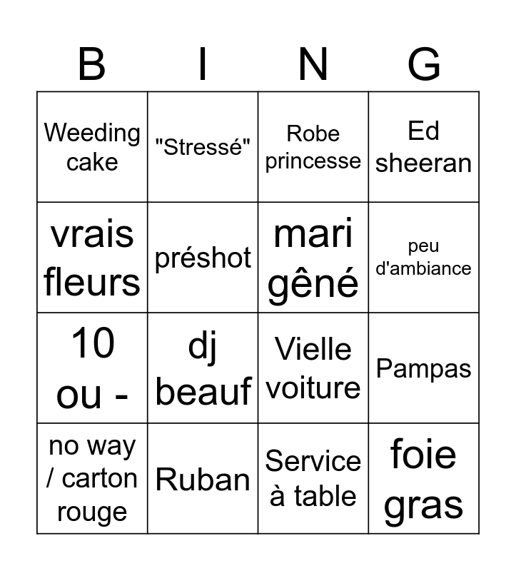 This bingo card has 16 words: Ruban, Pampas, Robe princesse, Weeding cake, 10 ou -, "Stressé", Vielle voiture, Service à table, vrais fleurs, préshot, no way / carton rouge, Ed sheeran, dj beauf, peu d'ambiance, mari gêné and foie gras.
