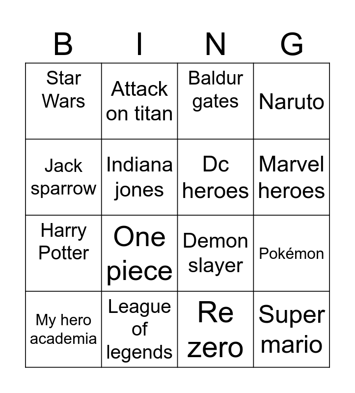 This bingo card has 16 words: League of legends, Pokémon, Baldur gates, Star Wars, Harry Potter, Attack on titan, Demon slayer, Re zero, Jack sparrow, Indiana jones, My hero academia, Naruto, One piece, Marvel heroes, Dc heroes and Super mario.