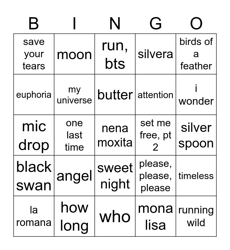 This bingo card has a free space and 24 words: angel, how long, butter, la romana, birds of a feather, save your tears, euphoria, moon, set me free, pt 2, sweet night, attention, mic drop, please, please, please, timeless, my universe, mona lisa, silver spoon, run, bts, i wonder, one last time, running wild, black swan, silvera and who.