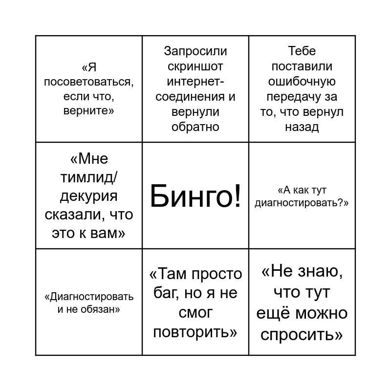 This bingo card has a free space and 8 words: «А как тут диагностировать?», Тебе поставили ошибочную передачу за то, что вернул назад, Запросили скриншот интернет-соединения и вернули обратно, «Диагностировать и не обязан», «Я посоветоваться, если что, верните», «Не знаю, что тут ещё можно спросить», «Мне тимлид/декурия сказали, что это к вам» and «Там просто баг, но я не смог повторить».