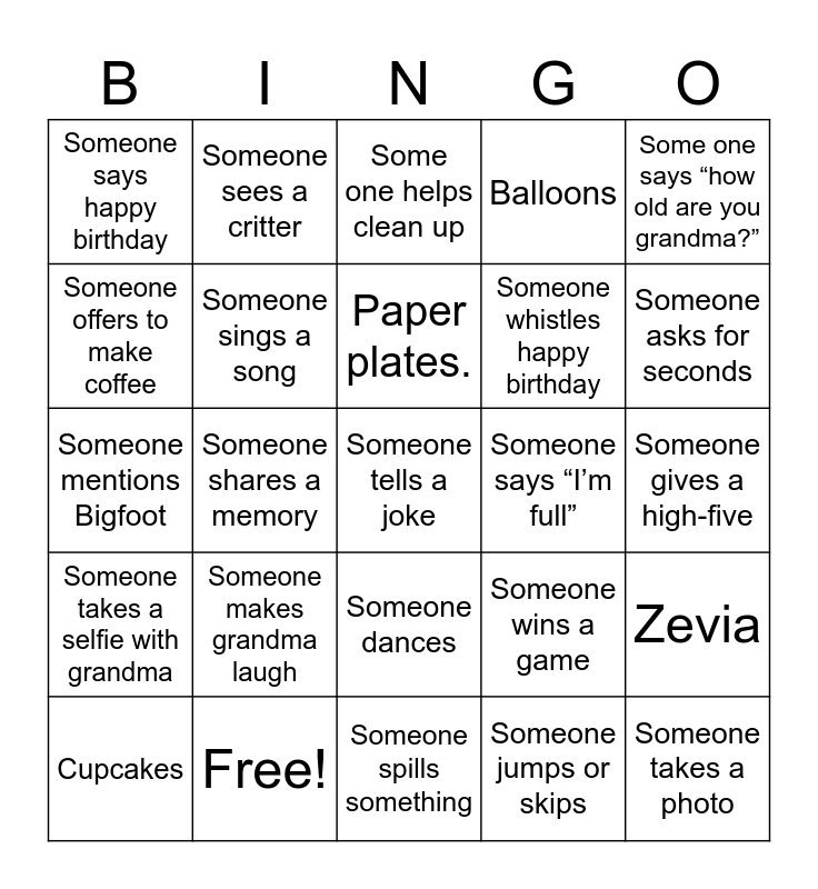 This bingo card has 30 words: Free!, Hugs grandma, Someone shares a memory, Someone compliments the food, Someone says happy birthday, Some one helps clean up, Someone sings a song, Someone dances, Someone says “I’m full”, Someone spills something, Someone gives a high-five, Someone tells a joke, Someone jumps or skips, Someone takes a photo, Someone asks for seconds, Someone says “this is fun”, Someone wins a game, Someone takes a selfie with grandma, Someone makes grandma laugh, Some one says “how old are you grandma?”, Someone mentions Bigfoot, Someone helps clean up the kitchen, Someone sees a critter, Someone whistles happy birthday, Someone offers to make coffee, Balloons, Zevia, Cupcakes, Paper plates. and Coffee.