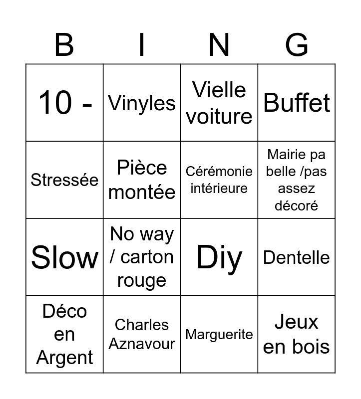 This bingo card has 16 words: Charles Aznavour, Dentelle, Vielle voiture, 10 -, Slow, Vinyles, Diy, Marguerite, Stressée, Pièce montée, Déco en Argent, Buffet, No way / carton rouge, Mairie pa belle /pas assez décoré, Cérémonie intérieure and Jeux en bois.