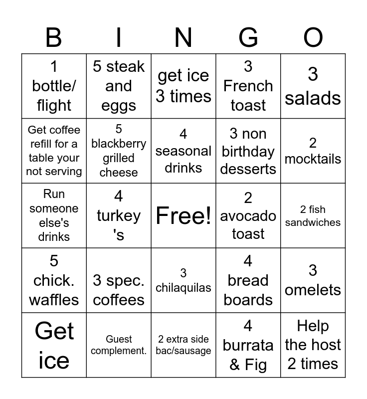This bingo card has a free space and 24 words: 3 spec. coffees, Guest complement., 4 seasonal drinks, Get ice, 3 salads, 1 bottle/ flight, Get coffee refill for a table your not serving, 5 steak and eggs, 2 avocado toast, 3 chilaquilas, 3 non birthday desserts, Run someone else's drinks, 4 bread boards, 3 omelets, 5 blackberry grilled cheese, 4 burrata & Fig, 2 fish sandwiches, get ice 3 times, 2 mocktails, 4 turkey 's, Help the host 2 times, 5 chick. waffles, 3 French toast and 2 extra side bac/sausage.