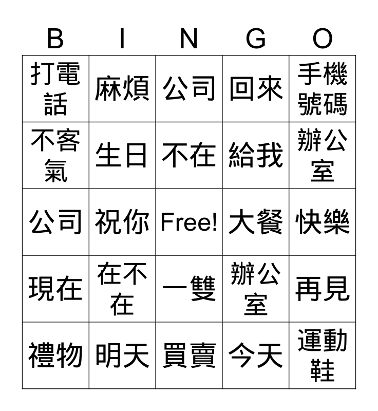 This bingo card has a free space and 29 words: 禮物, 沒問題, 祝你, 幾月幾號, 打電話, 公司, 生日, 在不在, 大餐, 明天, 快樂, 運動鞋, 買賣, 今天, 辦公室, 哪位, 一雙, 現在, 手機號碼, 公司, 辦公室, 送禮, 給我, 不客氣, 回來, 麻煩, 再見, 不在 and 以後.