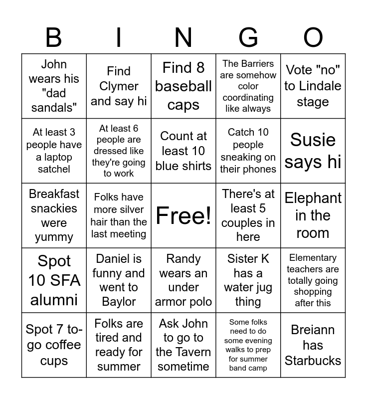 This bingo card has a free space and 24 words: Daniel is funny and went to Baylor, Folks are tired and ready for summer, Count at least 10 blue shirts, Spot 7 to-go coffee cups, Vote "no" to Lindale stage, John wears his "dad sandals", At least 3 people have a laptop satchel, Find Clymer and say hi, There's at least 5 couples in here, Randy wears an under armor polo, Catch 10 people sneaking on their phones, Breakfast snackies were yummy, Sister K has a water jug thing, Elementary teachers are totally going shopping after this, At least 6 people are dressed like they're going to work, Some folks need to do some evening walks to prep for summer band camp, Elephant in the room, Find 8 baseball caps, Susie says hi, Folks have more silver hair than the last meeting, Breiann has Starbucks, Spot 10 SFA alumni, The Barriers are somehow color coordinating like always and Ask John to go to the Tavern sometime.
