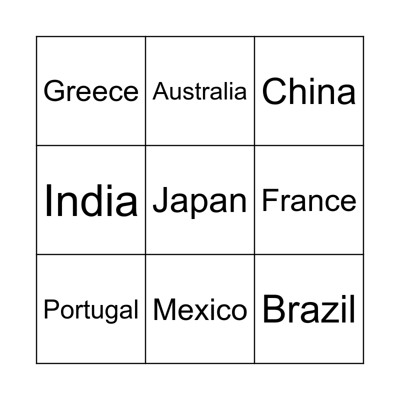This bingo card has a free space and 8 words: France, China, Australia, Portugal, Greece, Brazil, India and Mexico.