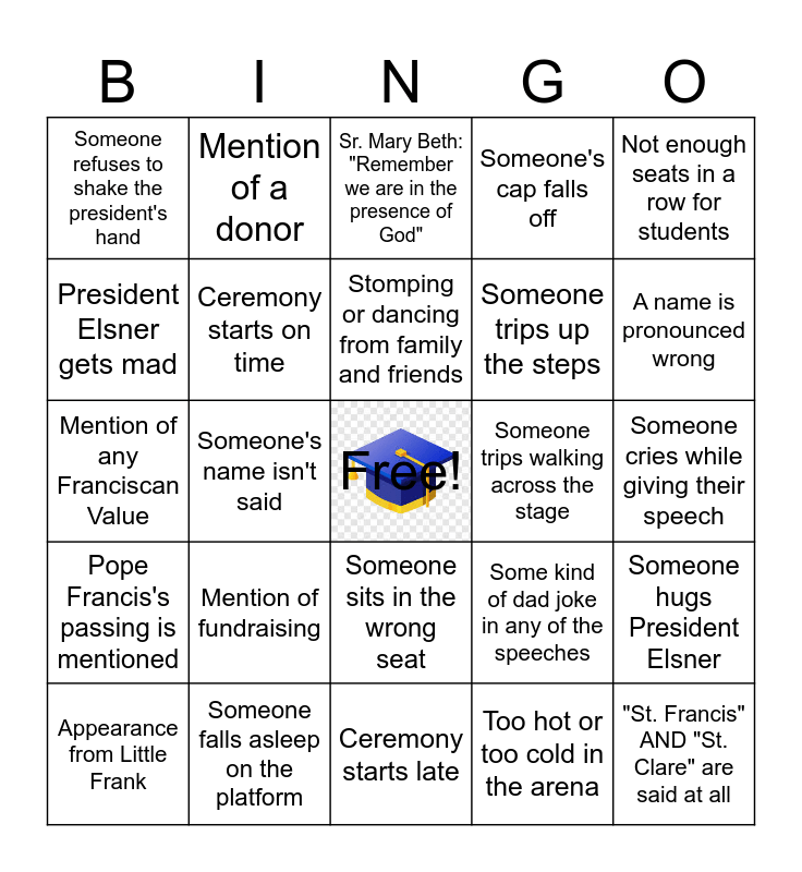 This bingo card has a free space and 24 words: Mention of fundraising, Someone falls asleep on the platform, Stomping or dancing from family and friends, Appearance from Little Frank, Not enough seats in a row for students, Someone refuses to shake the president's hand, President Elsner gets mad, Mention of a donor, Someone trips walking across the stage, Someone sits in the wrong seat, Someone trips up the steps, Mention of any Franciscan Value, Some kind of dad joke in any of the speeches, Someone hugs President Elsner, Ceremony starts on time, Too hot or too cold in the arena, Someone cries while giving their speech, Sr. Mary Beth: "Remember we are in the presence of God", A name is pronounced wrong, Someone's name isn't said, "St. Francis" AND "St. Clare" are said at all, Pope Francis's passing is mentioned, Someone's cap falls off and Ceremony starts late.