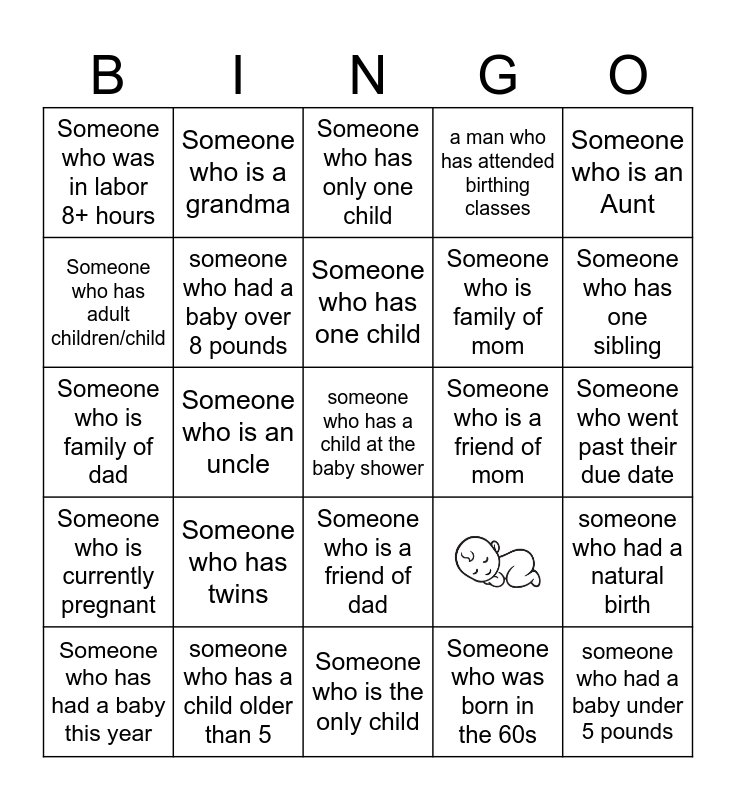 This bingo card has 1 images and 24 words: Someone who has twins, Someone who is the only child, Someone who has one child, Someone who has had a baby this year, Someone who is an Aunt, Someone who was in labor 8+ hours, Someone who has adult children/child, Someone who is a grandma, Someone who is a friend of mom, Someone who is a friend of dad, Someone who is family of mom, Someone who is family of dad, someone who had a natural birth, someone who had a baby over 8 pounds, someone who had a baby under 5 pounds, Someone who went past their due date, Someone who has only one child, Someone who has one sibling, Someone who is an uncle, someone who has a child at the baby shower, someone who has a child older than 5, Someone who is currently pregnant, a man who has attended birthing classes and Someone who was born in the 60s.