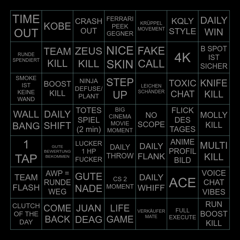 This bingo card has 49 words: ACE, 4K, VERKÄUFER MATE, DAILY SHIFT, NINJA DEFUSE/ PLANT, MOLLY KILL, KOBE, JUAN DEAG, KQLY STYLE, DAILY THROW, DAILY WIN, FERRARI PEEK GEGNER, TOXIC CHAT, LEICHEN SCHÄNDER, AWP = RUNDE WEG, FLICK DES TAGES, RUNDE SPENDIERT, B SPOT IST SICHER, VOICE CHAT VIBES, KRÜPPEL MOVEMENT, FAKE CALL, TOTES SPIEL (2 min), TIME OUT, TEAM KILL, CLUTCH OF THE DAY, ZEUS KILL, KNIFE KILL, COME BACK, STEP UP, BOOST KILL, RUN BOOST KILL, NO SCOPE, TEAM FLASH, GUTE NADE, WALL BANG, DAILY FLANK, ANIME PROFIL BILD, MULTI KILL, SMOKE IST KEINE WAND, LUCKER 1 HP FUCKER, CS 2 MOMENT, 1 TAP, BIG CINEMA MOVIE MOMENT, LIFE GAME, NICE SKIN, CRASH OUT, DAILY WHIFF, GUTE BEWERTUNG BEKOMMEN and FULL EXECUTE.