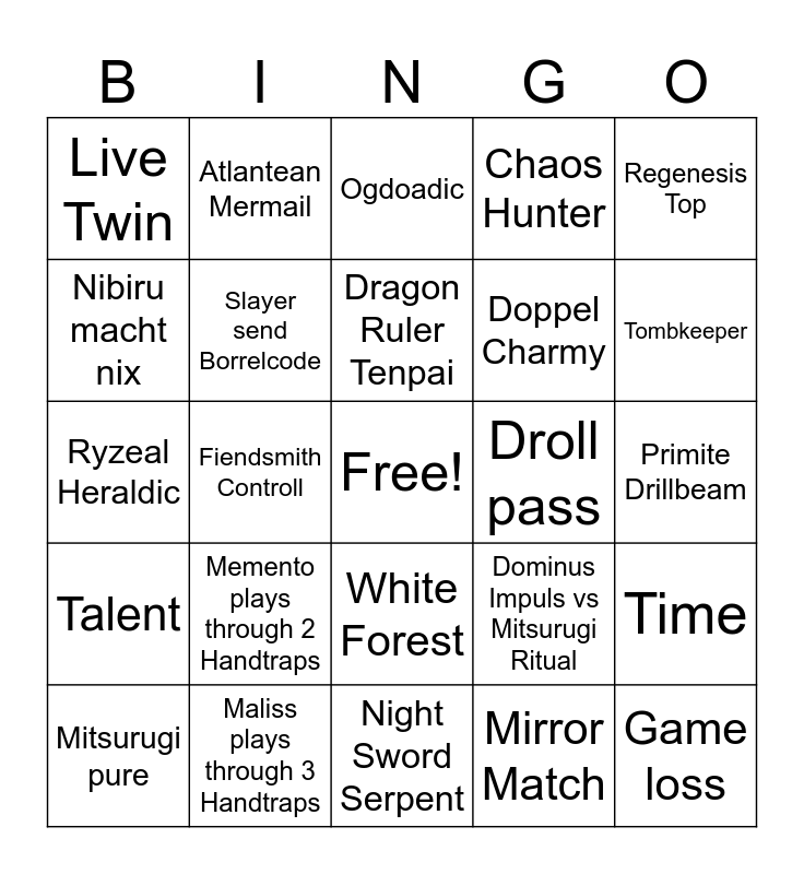 This bingo card has a free space and 24 words: Memento plays through 2 Handtraps, Maliss plays through 3 Handtraps, Dragon Ruler Tenpai, Mitsurugi pure, Regenesis Top, Live Twin, Nibiru macht nix, Atlantean Mermail, Droll pass, White Forest, Doppel Charmy, Ryzeal Heraldic, Dominus Impuls vs Mitsurugi Ritual, Time, Slayer send Borrelcode, Mirror Match, Primite Drillbeam, Ogdoadic, Tombkeeper, Fiendsmith Controll, Game loss, Talent, Chaos Hunter and Night Sword Serpent.