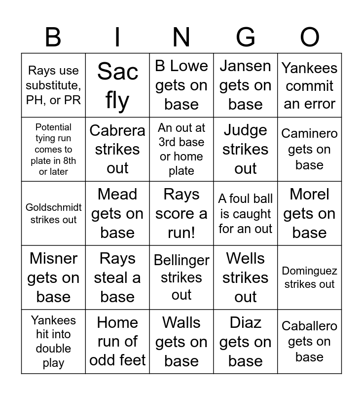 This bingo card has a free space and 24 words: Rays steal a base, Home run of odd feet, An out at 3rd base or home plate, Yankees hit into double play, Yankees commit an error, Rays use substitute, PH, or PR, Potential tying run comes to plate in 8th or later, Sac fly, A foul ball is caught for an out, Bellinger strikes out, Judge strikes out, Goldschmidt strikes out, Wells strikes out, Dominguez strikes out, Cabrera strikes out, Diaz gets on base, Morel gets on base, B Lowe gets on base, Caminero gets on base, Mead gets on base, Caballero gets on base, Misner gets on base, Jansen gets on base and Walls gets on base.