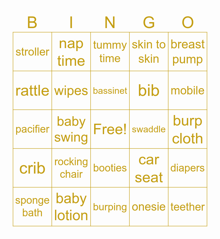 This bingo card has a free space and 29 words: baby, baby lotion, tummy time, wake windows, breast pump, stroller, wipes, bassinet, swaddle, diapers, sponge bath, baby swing, onesie, teether, pacifier, bottle, burping, car seat, mobile, crib, rocking chair, high chair, bib, burp cloth, rattle, nap time, booties, skin to skin and newborn.