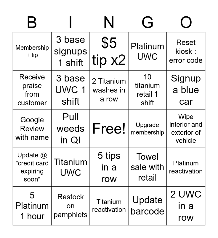 This bingo card has a free space and 24 words: Titanium UWC, Restock on pamphlets, 2 Titanium washes in a row, 5 Platinum 1 hour, Reset kiosk : error code, Membership + tip, Receive praise from customer, 3 base signups 1 shift, Upgrade membership, 5 tips in a row, 10 titanium retail 1 shift, Google Review with name, Towel sale with retail, Platinum reactivation, 3 base UWC 1 shift, Update barcode, Wipe interior and exterior of vehicle, $5 tip x2, Signup a blue car, Pull weeds in QI, 2 UWC in a row, Update @ "credit card expiring soon", Platinum UWC and Titanium reactivation.