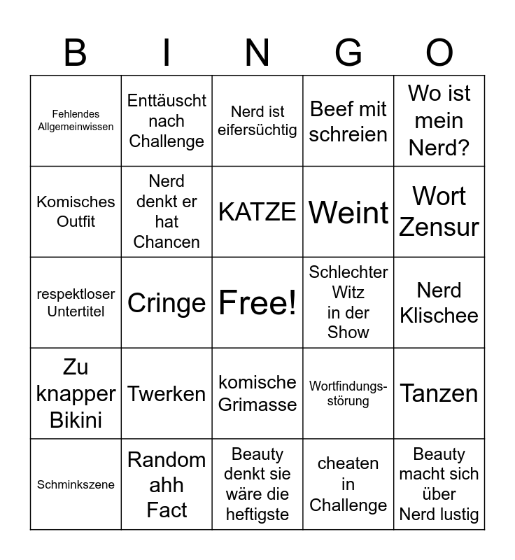 This bingo card has a free space and 38 words: Titten, Arsch, Nerd ist sozial unbeholfen, Nerd denkt er hat Chancen, Tanzen, Twerken, KATZE, Küssen, Wo ist mein Nerd?, Weint, Cringe, Beef mit schreien, Beauty macht sich über Nerd lustig, Nerd Klischee, Komisches Outfit, Zu knapper Bikini, Probleme bei der Bettenverteilung, Nerd ist eifersüchtig, Alkohol, Schlechter Witz in der Show, Fehlendes Allgemeinwissen, Random ahh Fact, Wort Zensur, Schminkszene, Markentalk/Teure Klamotten, Beauty denkt sie wäre die heftigste, Leoparden Print, Nerd im Pool/Jaccuzi, Beautys lästern, Meckern, Etwas kaputt/verschüttet, komische Grimasse, cheaten in Challenge, Enttäuscht nach Challenge, Nerd redet über Mutter, Wortfindungs- störung, respektloser Untertitel and Fummeln.