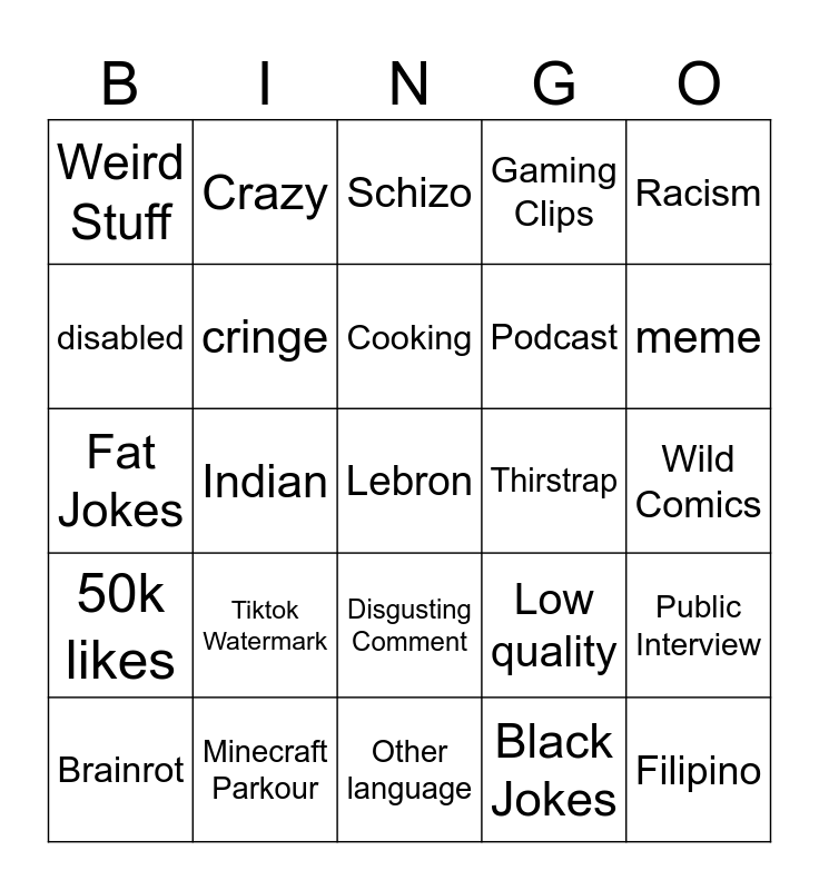 This bingo card has 25 words: 50k likes, Minecraft Parkour, Lebron, Black Jokes, Racism, Weird Stuff, Crazy, Schizo, Thirstrap, Public Interview, disabled, cringe, Other language, Low quality, meme, Brainrot, Indian, Cooking, Podcast, Wild Comics, Fat Jokes, Tiktok Watermark, Disgusting Comment, Gaming Clips and Filipino.
