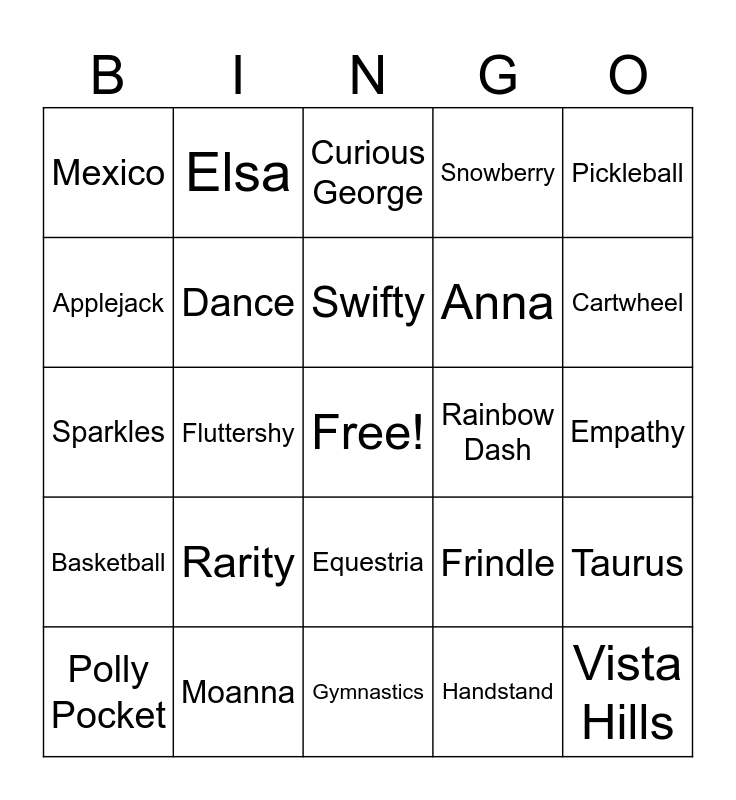 This bingo card has a free space and 25 words: Rarity, Gymnastics, Swifty, Polly Pocket, Pickleball, Mexico, Applejack, Elsa, Rainbow Dash, Equestria, Anna, Sparkles, Frindle, Taurus, Dance, Pinkie Pie, Empathy, Curious George, Cartwheel, Fluttershy, Vista Hills, Moanna, Basketball, Snowberry and Handstand.