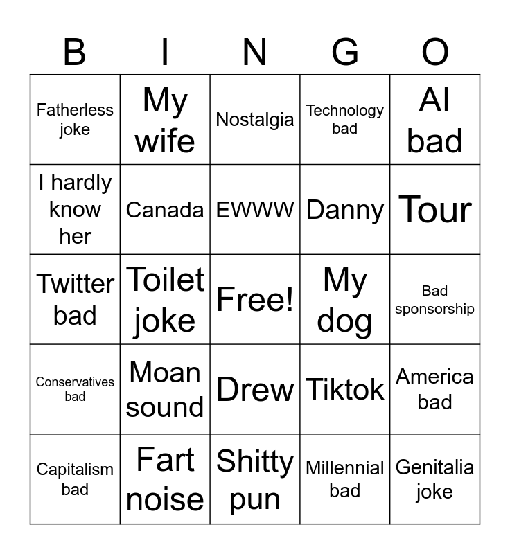 This bingo card has a free space and 24 words: Moan sound, Fart noise, EWWW, Capitalism bad, AI bad, Fatherless joke, I hardly know her, My wife, My dog, Drew, Danny, Twitter bad, Tiktok, America bad, Canada, Millennial bad, Bad sponsorship, Nostalgia, Tour, Toilet joke, Genitalia joke, Conservatives bad, Technology bad and Shitty pun.