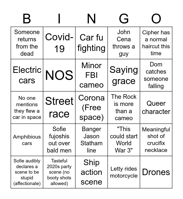 This bingo card has a free space and 24 words: Sofie fujoshis out over bald men, Tasteful 2020s party scene (no booty shots allowed), Minor FBI cameo, Sofie audibly declares a scene to be stupid (affectionate), Cipher has a normal haircut this time, Someone returns from the dead, Electric cars, Covid-19, The Rock is more than a cameo, Banger Jason Statham line, Saying grace, No one mentions they flew a car in space, "This could start World War 3", Meaningful shot of crucifix necklace, NOS, Letty rides motorcycle, Queer character, Car fu fighting, Dom catches someone falling, Street race, Drones, Amphibious cars, John Cena throws a guy and Ship action scene.