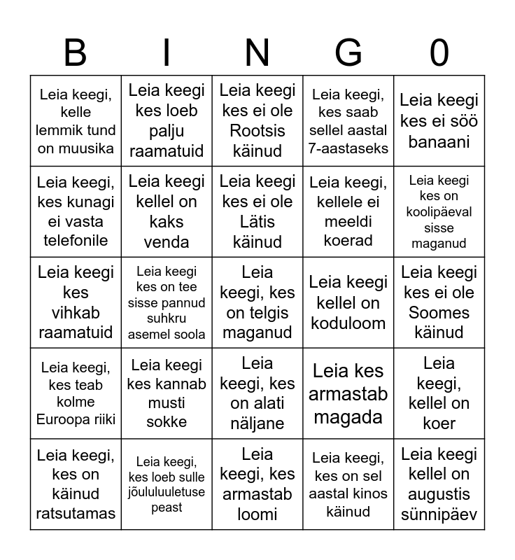 This bingo card has 25 words: Leia keegi kes kannab musti sokke, Leia keegi, kes armastab loomi, Leia keegi kes ei ole Lätis käinud, Leia keegi, kes on käinud ratsutamas, Leia keegi kes ei söö banaani, Leia keegi, kelle lemmik tund on muusika, Leia keegi, kes kunagi ei vasta telefonile, Leia keegi kes loeb palju raamatuid, Leia keegi kellel on koduloom, Leia keegi, kes on alati näljane, Leia keegi, kellele ei meeldi koerad, Leia keegi kes vihkab raamatuid, Leia kes armastab magada, Leia keegi, kellel on koer, Leia keegi kellel on kaks venda, Leia keegi kellel on augustis sünnipäev, Leia keegi kes ei ole Soomes käinud, Leia keegi kes ei ole Rootsis käinud, Leia keegi kes on koolipäeval sisse maganud, Leia keegi kes on tee sisse pannud suhkru asemel soola, Leia keegi, kes on telgis maganud, Leia keegi, kes loeb sulle jõululuuletuse peast, Leia keegi, kes teab kolme Euroopa riiki, Leia keegi, kes saab sellel aastal 7-aastaseks and Leia keegi, kes on sel aastal kinos käinud.
