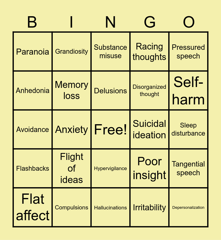 This bingo card has a free space and 25 words: Flight of ideas, Hallucinations, Delusions, Flat affect, Pressured speech, Paranoia, Anhedonia, Grandiosity, Suicidal ideation, Hypervigilance, Disorganized thought, Avoidance, Poor insight, Tangential speech, Memory loss, Psychomotor agitation, Sleep disturbance, Substance misuse, Self-harm, Anxiety, Depersonalization, Compulsions, Flashbacks, Racing thoughts and Irritability.