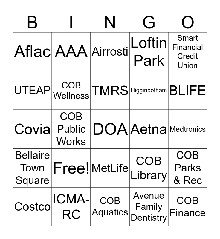 This bingo card has a free space and 24 words: Free!, ICMA-RC, TMRS, Costco, Smart Financial Credit Union, Aflac, UTEAP, AAA, Aetna, MetLife, Higginbotham, Covia, COB Library, COB Parks & Rec, COB Wellness, Avenue Family Dentistry, Medtronics, Airrosti, BLIFE, COB Public Works, COB Finance, Bellaire Town Square, Loftin Park and COB Aquatics.